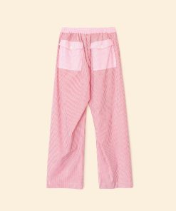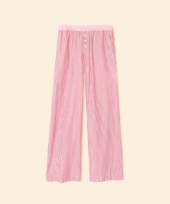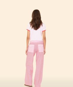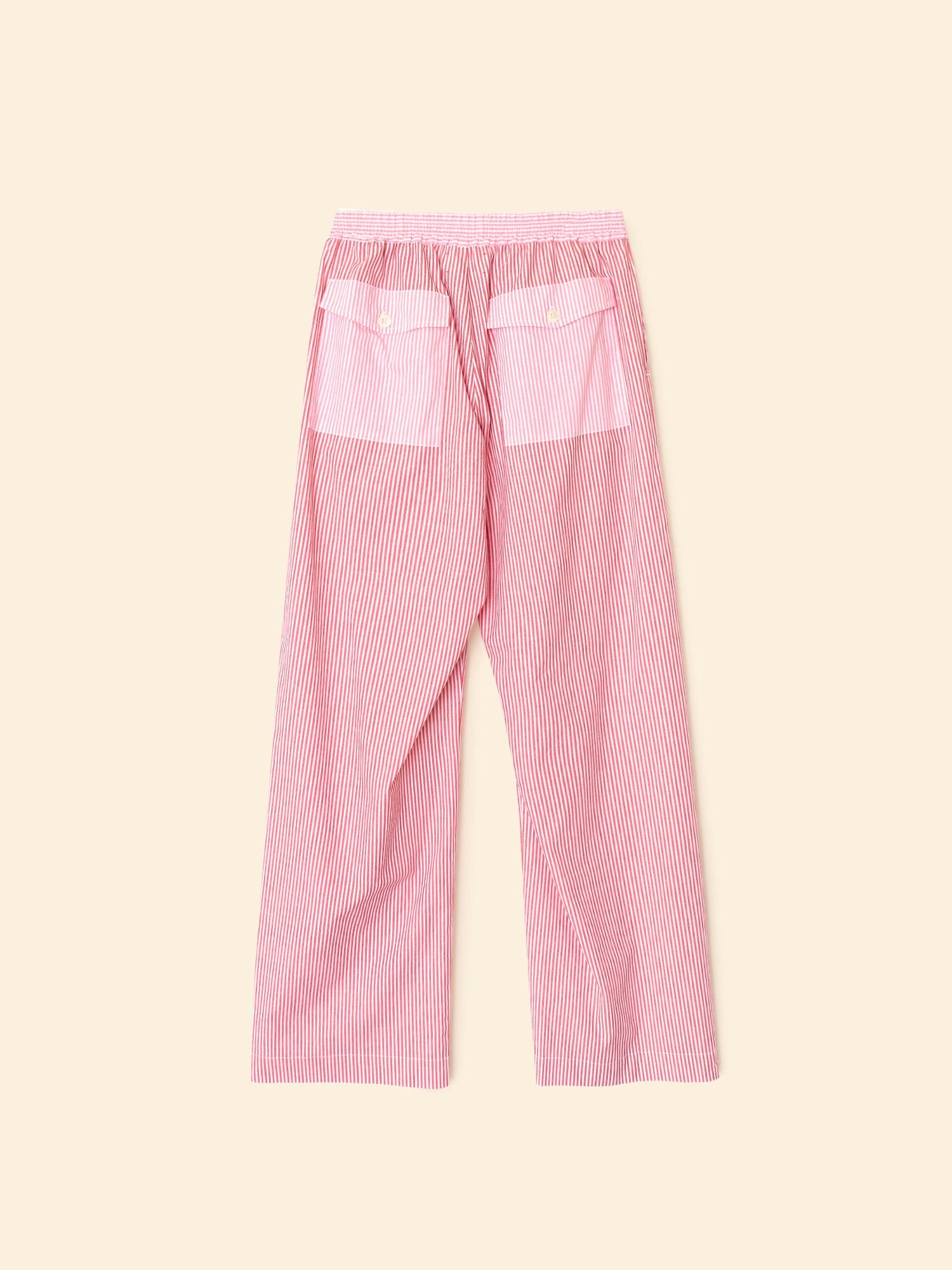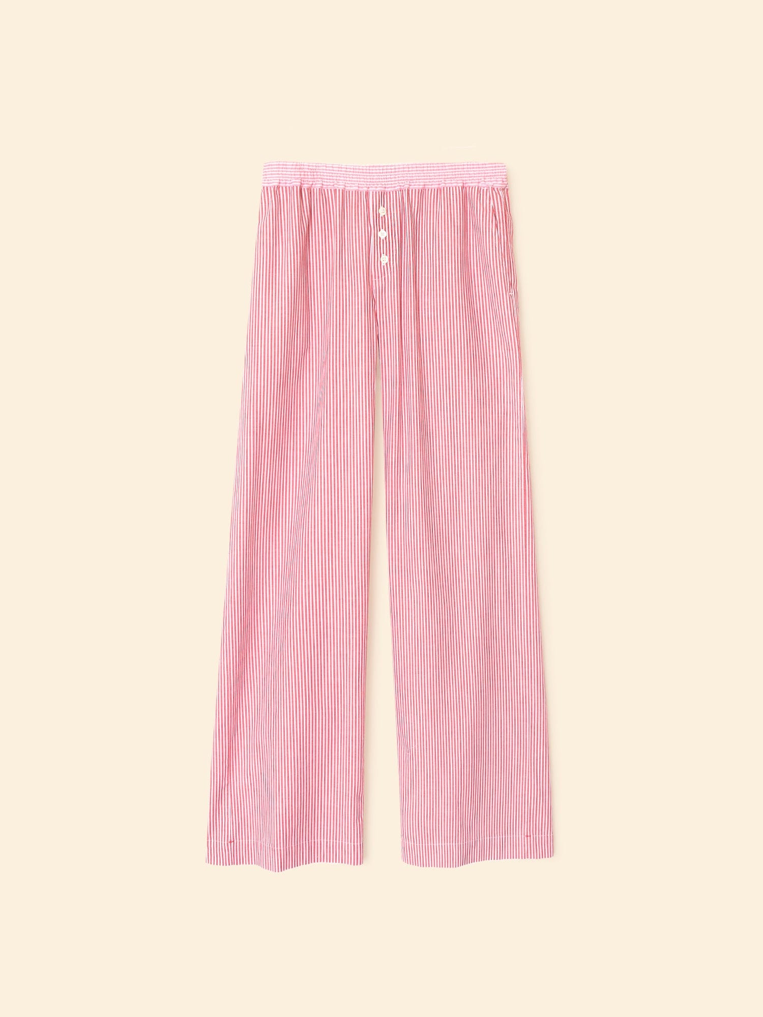French allure meets California ease. Made in our crisp cotton stripe, Maxime is a wide leg pant with a faux button fly and contrast color stripe elasticized waist, side seam pockets, and back pockets with button closures.