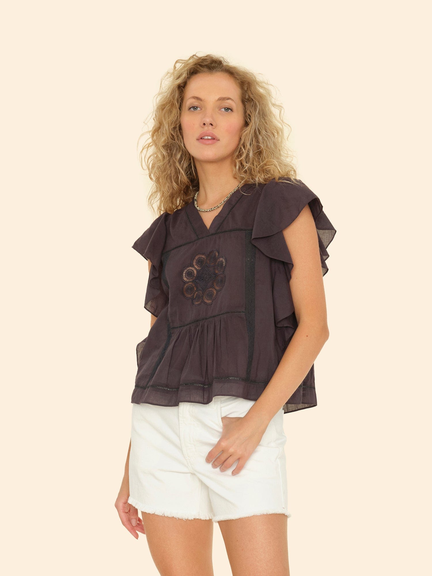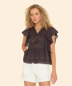 Picture Perfect. Mara is new this season in our superfine cotton voile with a soft hand. This femme blouse features a V-neck, center-front floral broderie anglaise, flutter sleeves down side panel, and ladder trim throughout.