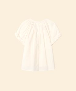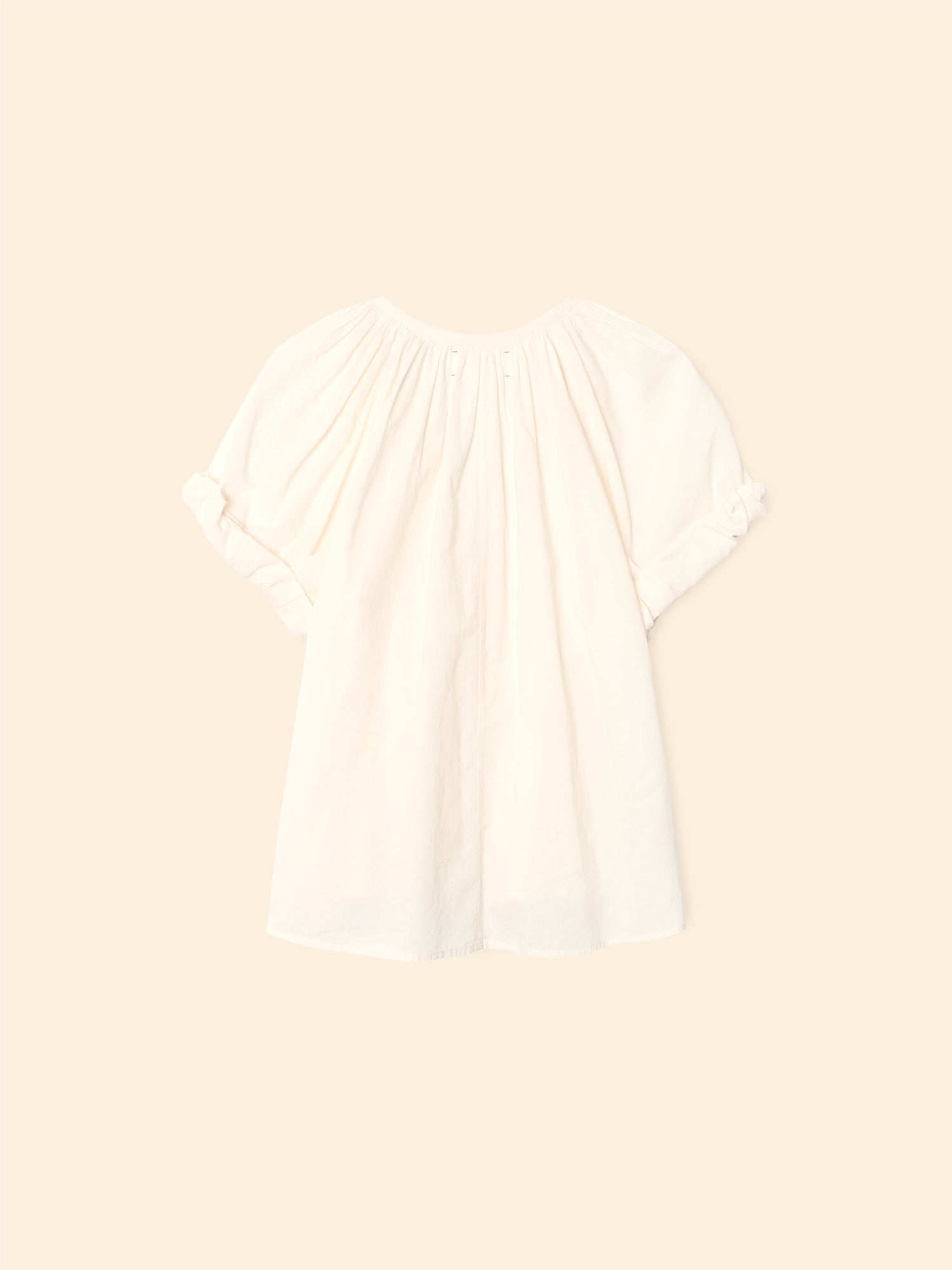 Easy does it. Calla is new this season in our classic lightweight woven cotton poplin for a lived-in look and feel. Calla is a short sleeve raglan top with stitched rolled puff sleeves, rouleau button-front, and shirred details throughout.