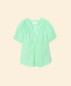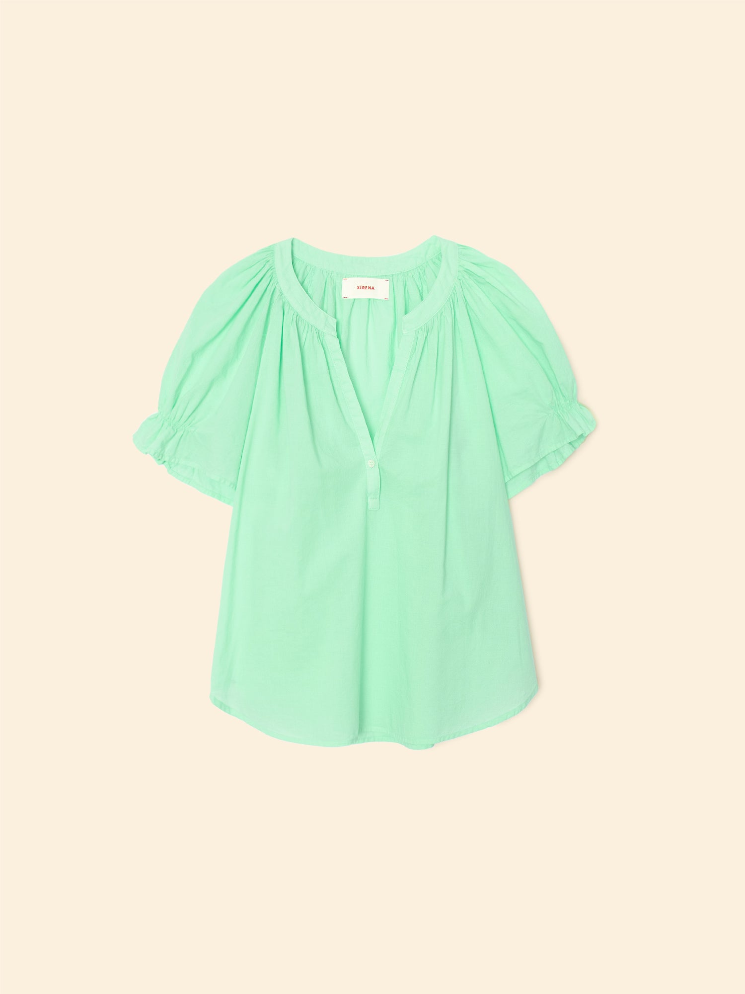 Pretty Please. Astryde is made in our classic lightweight woven cotton poplin for a lived-in look and feel. Astryde is a femme V-neck blouse that features a singular button-closure, short puff raglan sleeves with elastic ruffles, and shirred details throughout.
