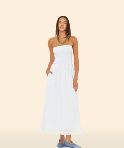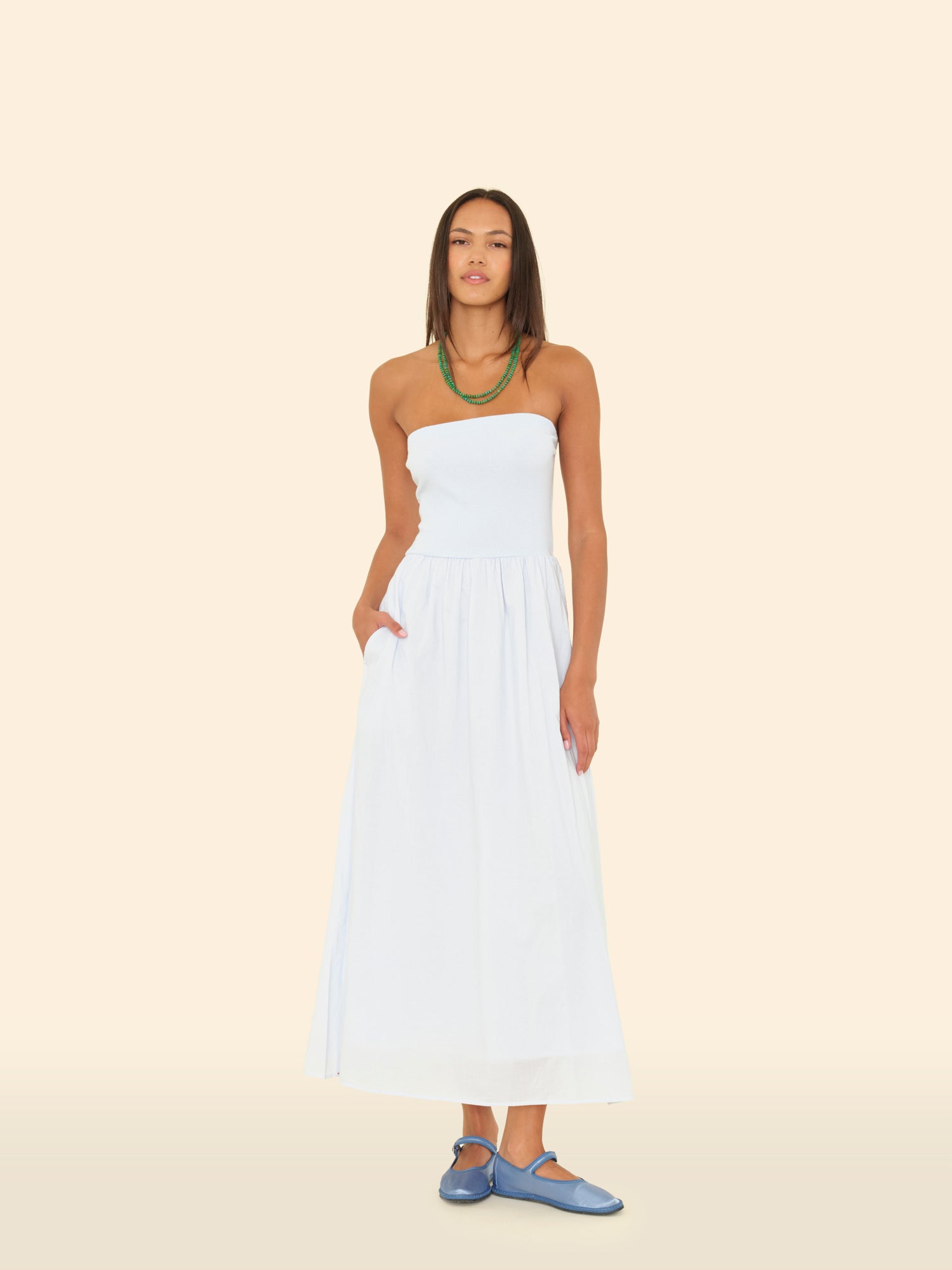 Best of Both Worlds. Finnian is back this season in our classic lightweight woven cotton poplin for a lived-in look and feel. This fully lined strapless maxi dress has a contrast cotton rib knit top, full skirt, and side seam pockets.