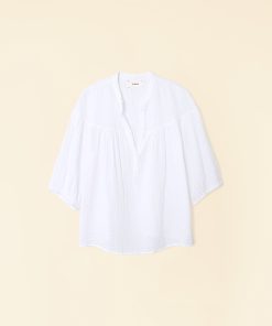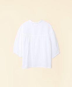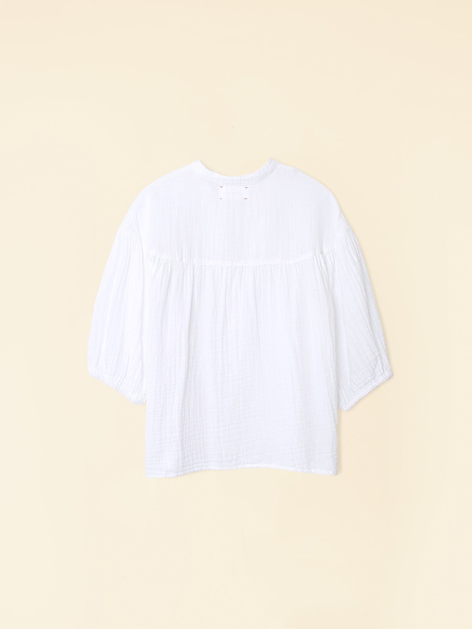 Bare Necessities. Clem is made in our washed double faced cotton gauze for a soft, gently crinkled feel. This easy popover has a split V-neck, three-quarter length sleeves, and shirred yoke.
